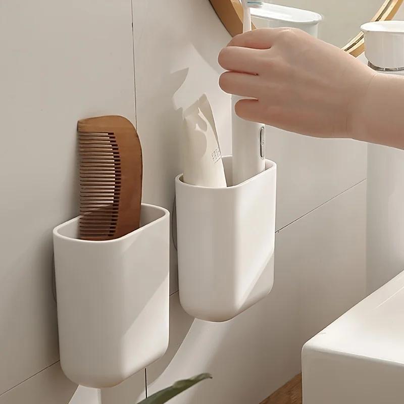 Modern Minimalist White Bathroom Organizer-Mounted Toothbrush Holder&Toothpaste Cup with Drainage Slots,Hygienic Storage