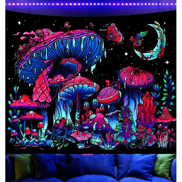 Onivein Blacklight Mushroom Tapestry Glow in the Dark Fantasy Plant Tapestry UV Reactive Moon Butterfly Frog Tapestries Poster Wall Hanging for