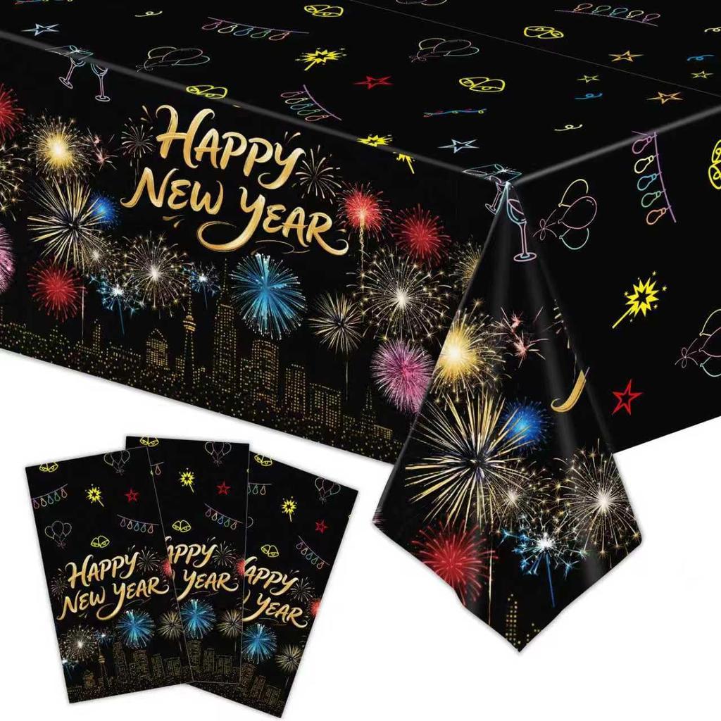 3pcs Happy New Year Tablecloth, Disposable Black Gold NYE Party Tablecloth Decorations, Rectangular Plastic Table Cover NYE Theme Supplies for