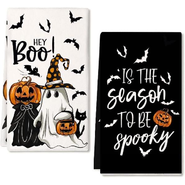 ARKENY Pumpkin Ghost Halloween Kitchen Towels Set of 2,Black Bat Boo Dish Towels 18x26 Inch,Farmhouse Home Indoor Vintage Party Decoration AD394