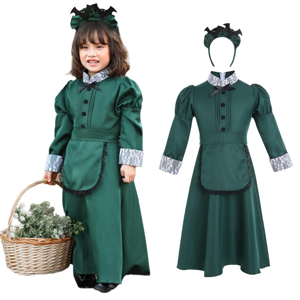 Milky Time Halloween Cosplay Maid Long Western-Style Costume, Women's, Green, (130cm, Kids)