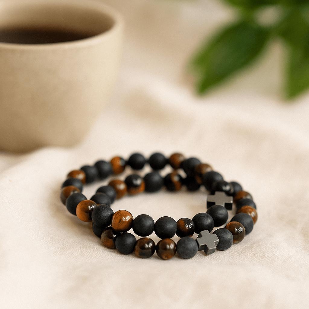 Cool, smooth gemstones settle softly against the wrist: tiger eye catching a quiet golden flash beside deep black stone. Two easy loops to honor what you share—calm, steady, and close. 🤝