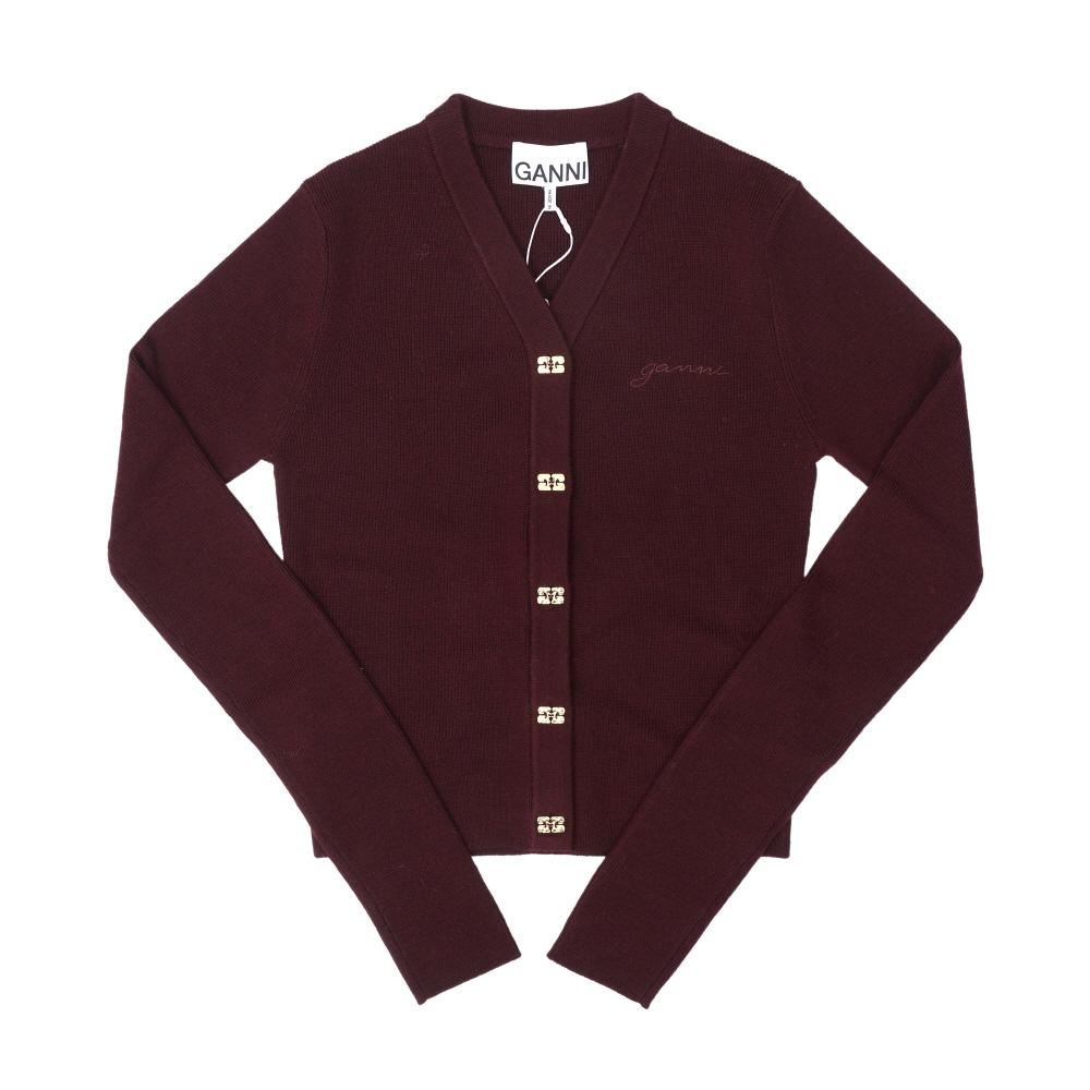 The GANNI Mini Rib Merino V-Neck Cardigan A1070117 is a women's cardigan featuring a button v-neck design made from mini rib merino wool material. It offers a lightweight feel with a thick shoulder strap structure for stability, making it a stylish choice for a minimalist look without any sheerness. The color is burgundy, reflecting a soft autumn tone.