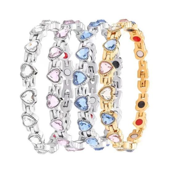 Embedded magnetic elements positioned close to the wrist enhance wellness benefits, while the sturdy clasp provides a secure and comfortable fit.