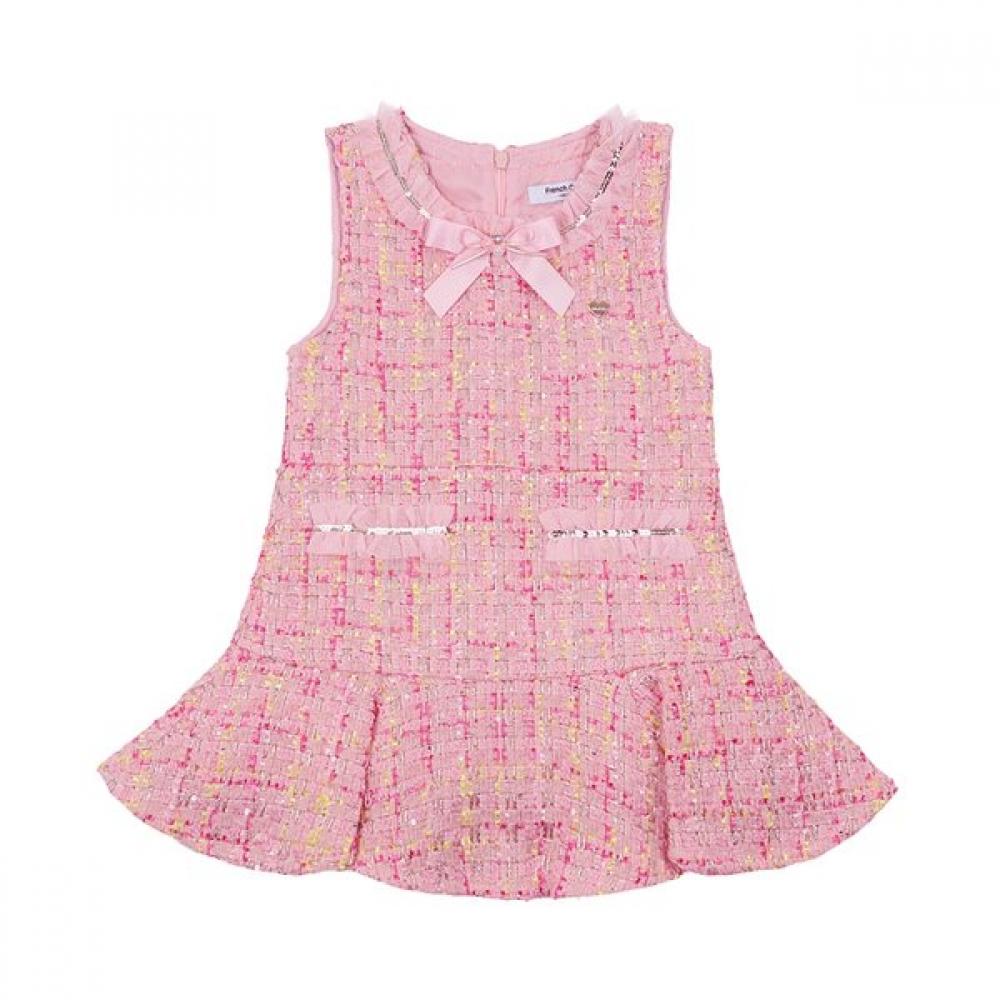 French Cat Pink Frill Tweed Jumper Skirt Q51DCO110P1 is a product made of sparkling multi-pink tweed fabric with chiffon frill decorations. The removable ribbon brooch allows for various styling options.