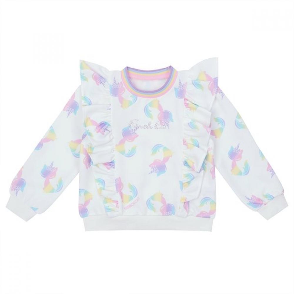 The IV French Cat Cat Print MTM is a sweatshirt that features an adorable cat print. The unicorn-like rainbow cat design is very popular among children. The frill detail on both sides adds to its cute charm.