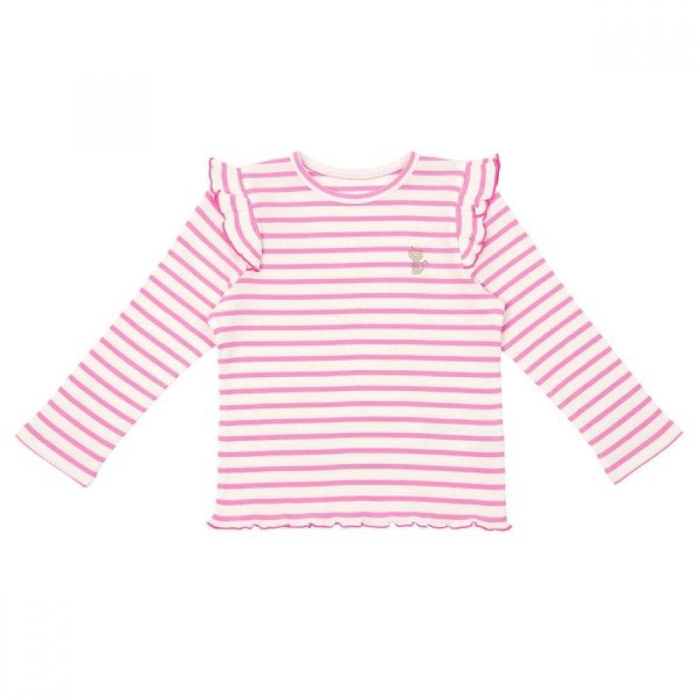 This is a PK striped t-shirt. The shoulder ruffles are added to give it a cute and lovely feel, and the ribbed material is stretchy, making it a comfortable item to wear and do activities. It's a basic item, and it's a great item to wear with any pants.