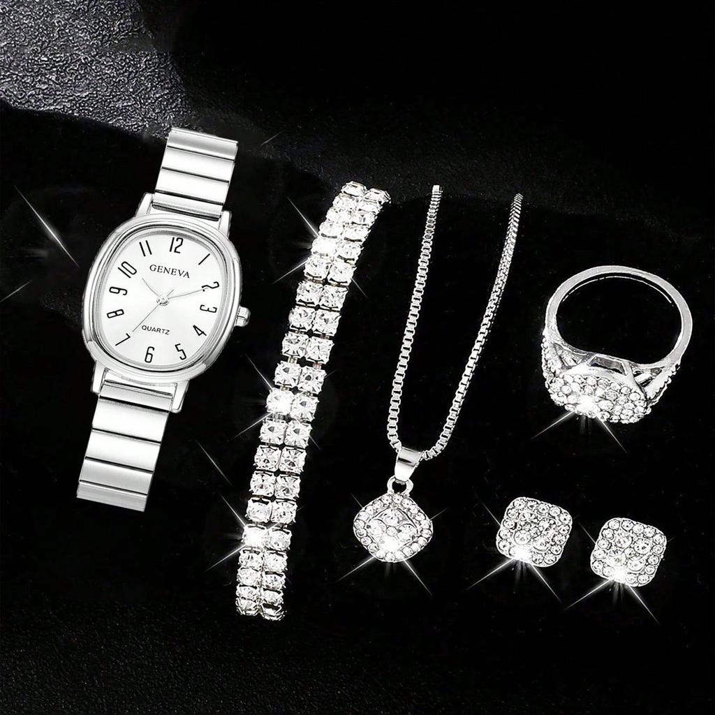6pcs/Set-Fashion Trendy Steel Strap Bamboo Knot Watch Shining Square Dial Ring Necklace Set - Retro Style