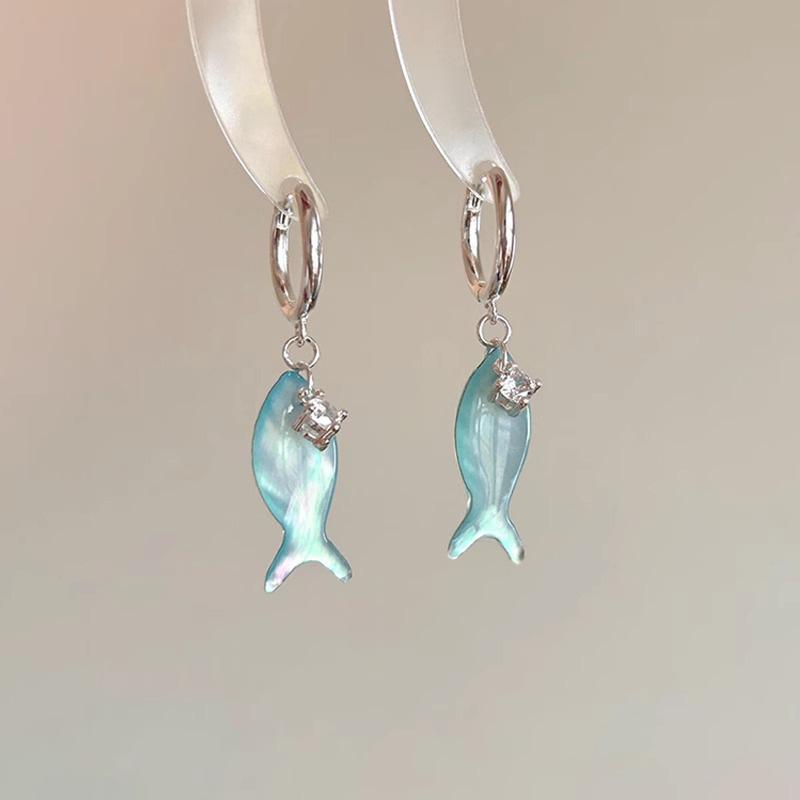 Y2K Blue Small Fish Pendant Earrings for Women Fashion Sweet Crystal Asymmetric Ear Buckle Seaside Vacation Jewelry Accessories