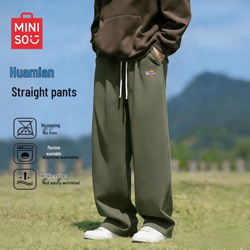 These MINISO men's casual sport straight-leg pants are perfect for spring and autumn. Featuring a simple, heavy drape design with a relaxed, versatile fit, these sweatpants offer both comfort and style. Made from a blend of cotton and polyester, they provide a slight stretch and are suitable for daily wear and lounging.
