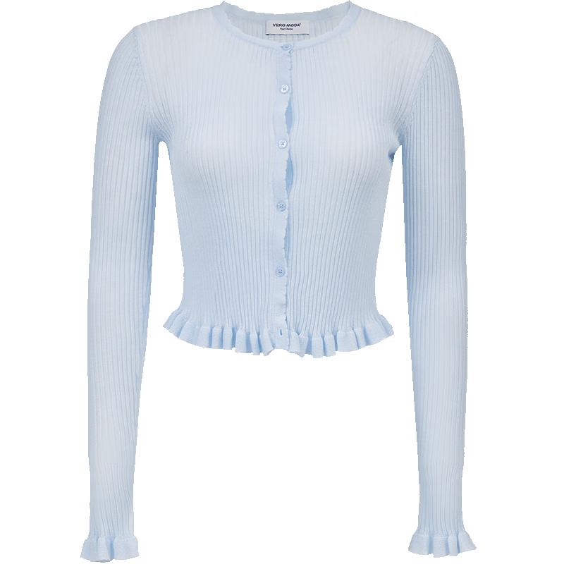 Embrace summer style with the VEROMODA Women's Knit Cardigan. This slim-fit, short-length top features elegant lace trim and delicate bell sleeves, crafted from a comfortable blend of 78% Viscose and 22% Polyester. Its semi-transparent, solid color design with a classic round neck makes it a versatile addition to your wardrobe.