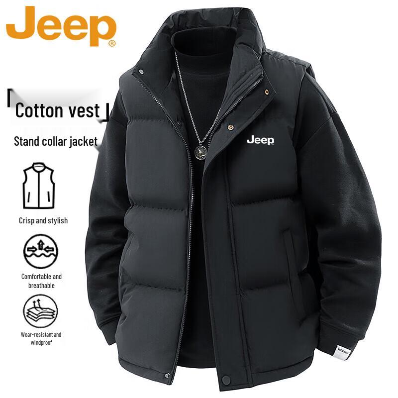 This JEEP Men's Padded Stand Collar Vest is designed for autumn and winter outdoor activities. It features a windproof and warm construction, making it ideal for staying comfortable in cooler weather. The sleeveless design allows for freedom of movement, perfect for sports or everyday casual wear.