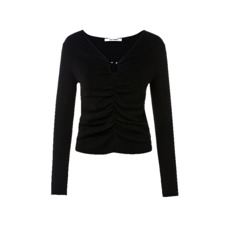 This elegant Lanzi V-neck knit top features a slim-fit design with long sleeves, perfect for commuting or as an inner layer. Made from a blend including triacetate fiber, Lyocell, nylon, and spandex, it offers comfort and style. Ideal for ages 30-34, it comes in classic black.