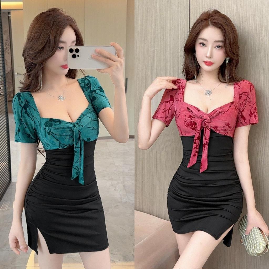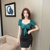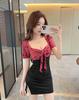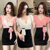 Tea break contrasting color dress women's summer new sexy low-cut small hip skirt