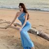 Lotus Leaf Collar Backless Strap Blue Suspender Skirt Sexy Split Mesh Dress Seaside Vacation Beach Skirt