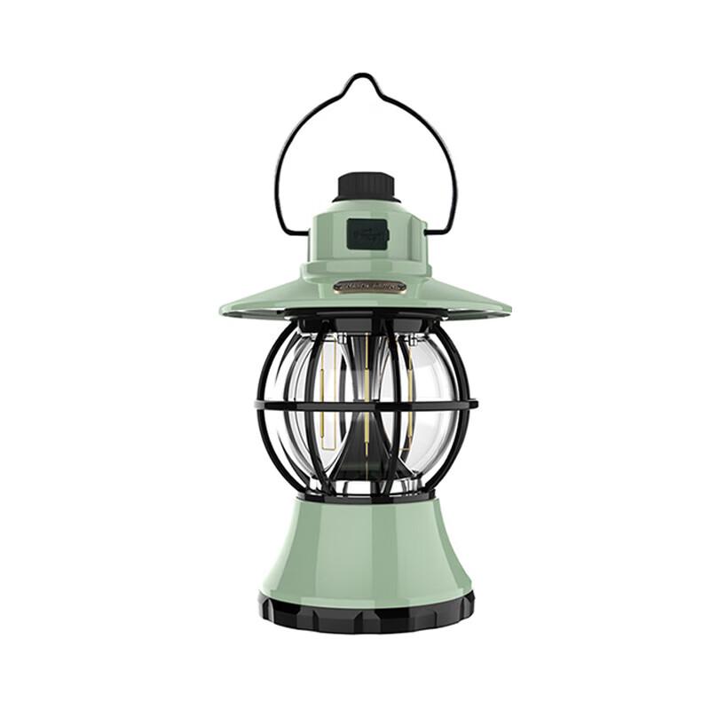 This vintage-style LED camping lantern provides reliable illumination for camping, outdoor activities, and emergencies. It is rechargeable and designed for hanging, offering practical and portable lighting.