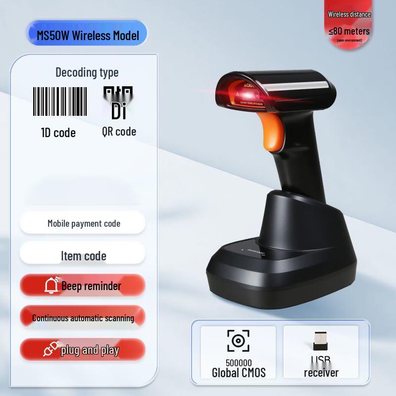 The Motorola MS50W is a versatile wireless barcode scanner designed for efficient data capture. Supporting both 1D and 2D barcode types, it features a buzzer for scan confirmation and a continuous automatic scanning mode for high-volume tasks. This model comes complete with a convenient charging cradle, making it ideal for retail, logistics, and office environments requiring reliable and untethered scanning.