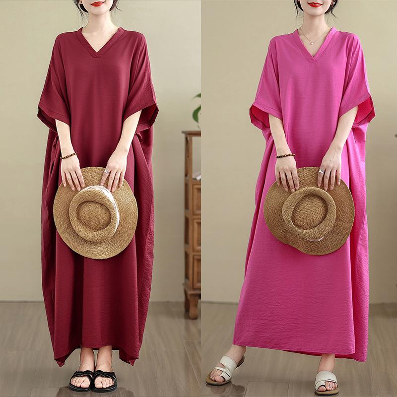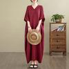 שמלת מקסי ארוכה רטרו מכותנה ופשתן עם צווארון V, פרחונית, לקיץ 2025