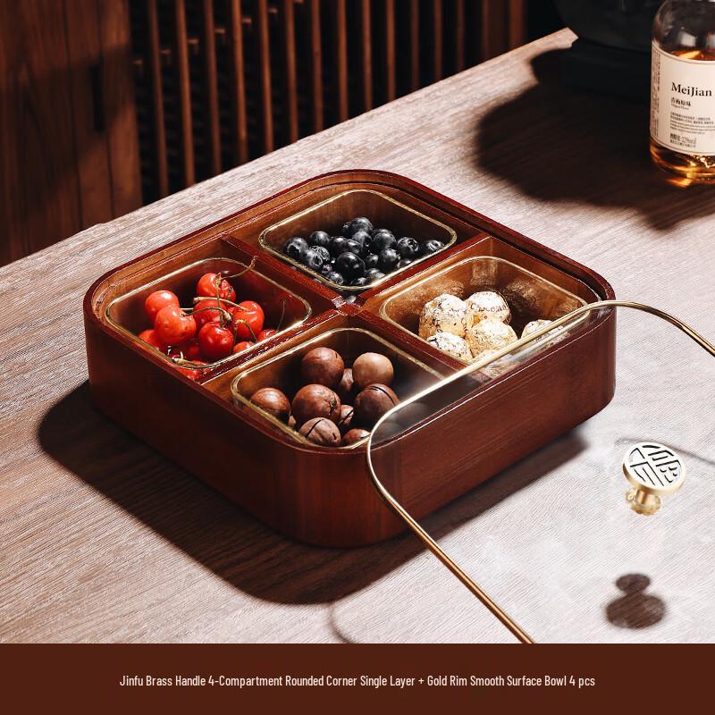 Elegant Chinese style solid wood snack box, perfect for serving nuts, dried fruits, and candies in your living room. Features a single layer design with four compartments and gold-rimmed bowls for a touch of sophistication.