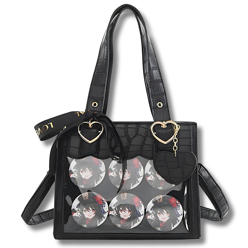 Luaex Ita Bag, Crocodile [2-Way Oshikatsu Bag], Crossbody, Lightweight, Self-Standing, Handle, Shoulder Strap, Ribbon, and Heart Charm (Black)