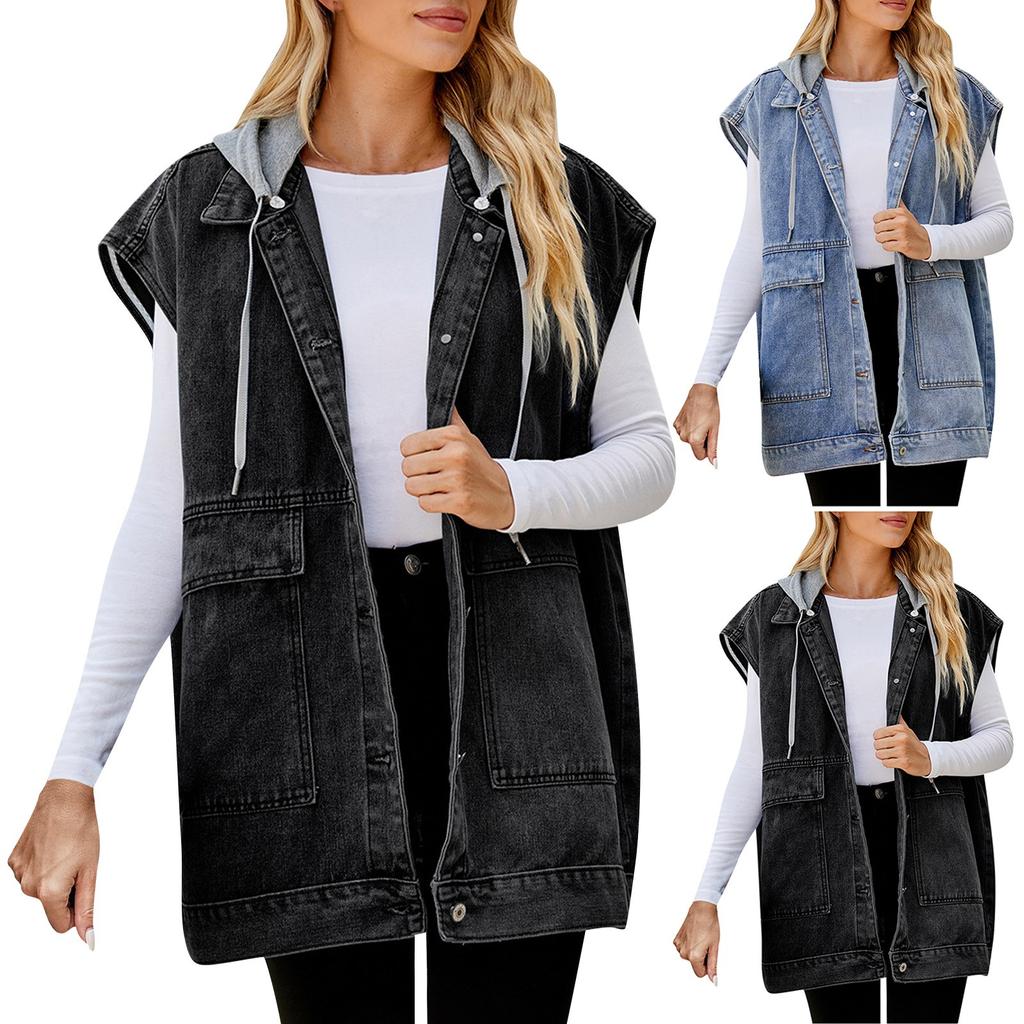 Women's Casual Denim Vest Vest Large Pocket Sleeveless Hooded Detachable Vest Jacket Features:
