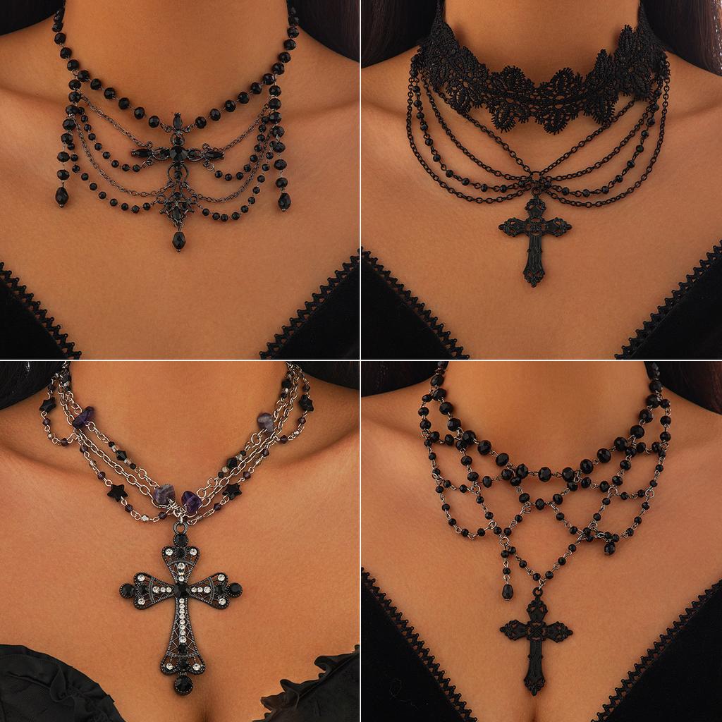 Gothic Dark Cross Necklace Female, Punk Crystal Beaded Fringed Collar Necklace