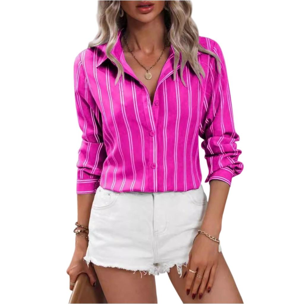 Women's Shirt Button V Neck Striped Loose Long Sleeve Cardigan Shirt Fashion Casual Tops