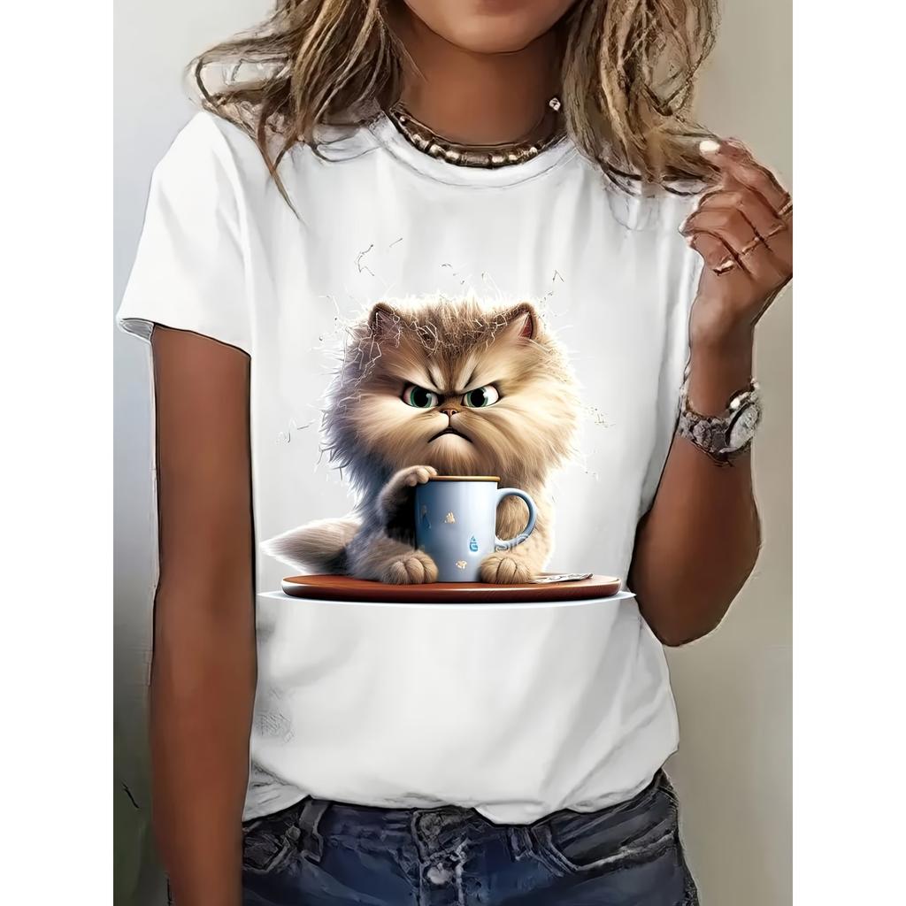 Women'S Cute Cat Graphic T-Shirt, Casual Crew Neck Short Sleeve Top Animal Print Applique, Spring/Summer