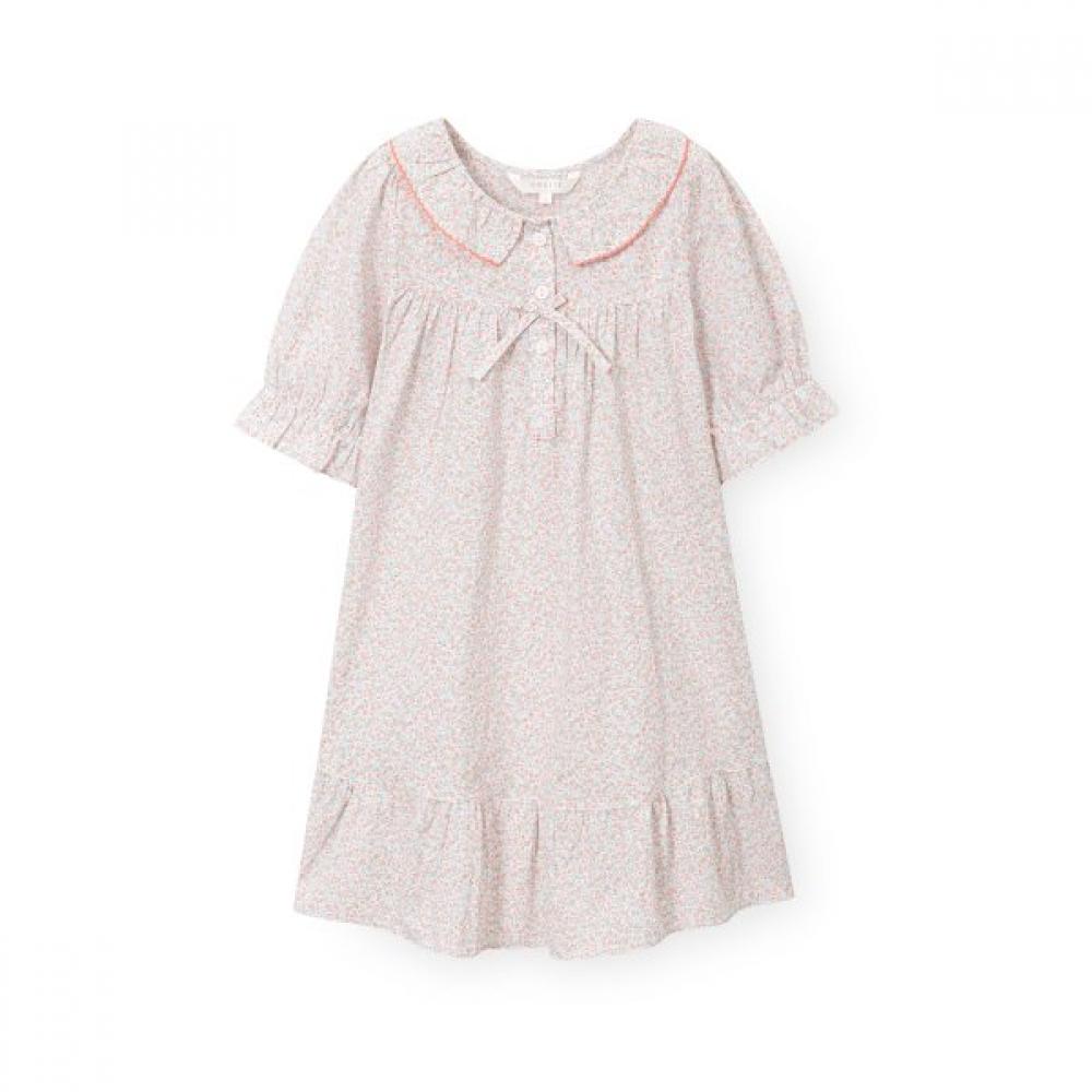 The Girls’ H004 Leheat 3/4 Sleeve Pajama Dress features a distant flower print and a round neckline, embellished with frill and ribbon details, while the sleeves are accented with contrasting frills. Made from soft 100% cotton, it offers a comfortable and cool fit with excellent durability.