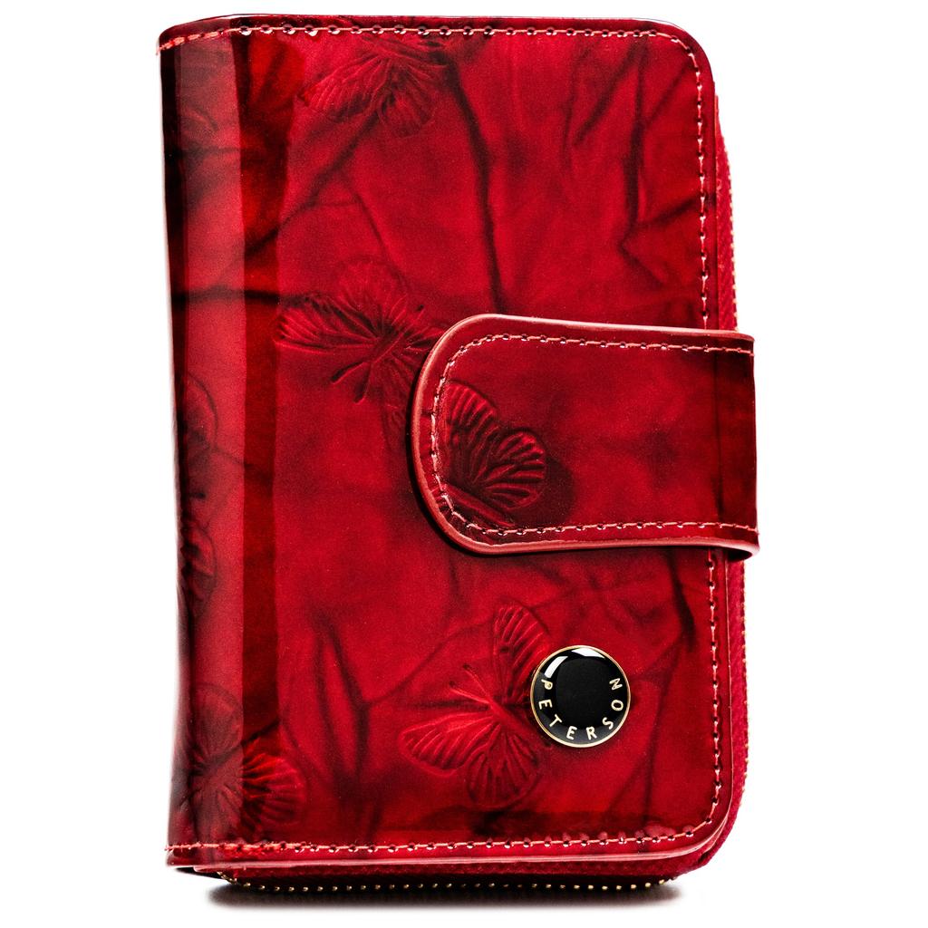 Peterson women's leather wallet, natural leather, RFID protection practical Vertical women's leather wallet with RFID Peterson®#⃣A brand with experience | Original wallet from the well-known and respected brand Peterson®, which has been operating in the leather goods market for many years.#⃣ High-quality material | Made of carefully selected natural leather, which guarantees quality for years.#⃣ Classic style| Vertical wallet with snap closure.#⃣ Very functional | The wallet has many compartments and pockets where you can easily store your most essential items.#⃣Anti-theft system | Equipped with RFID technology, which protects proximity cards, biometric documents, ID cards and public transport cards against unauthorized data reading. Parameters Manufacturer: Peterson® Material: Natural leather Color: red Height: 12.5 cm Width: 8.5 cm Depth: 3.5 cm Number of coin slots: 1 (double) Number of banknote slots: 1 Number of card or document slots: 9 (1 transparent) Number of larger document slots: 4 (1 transparent) Holds a registration certificate: yes Orientation: vertical External fastening: snap Color of zippers and fittings: gold Weight: 160 g Exceptional designWallet in an intensely red shade that combines elegance with an artistic character. Exterior wallet, made of patent leather, is decorated with delicate, embossed butterfly motifs. This fine pattern gives it a unique look, and the shiny surface beautifully reflects light, creating the effect of depth and sophistication. Spacious section for cards and documentsWallet for women who value space and functionality.Inside the wallet you will find: 9 compartments dedicated to cards, including one transparent one, which can also be used as a photo compartment; 4 large compartments for larger documents, including one transparent one;The compartments for cards and documents are protected with a lining. This allows you to avoid abrasions on the skin during use. Cash sectionWallet combines the needs of both those who prefer payments using bank cards and those who value traditional cash: You can hide your coins to the zippered compartment with 2 compartments. There is 1 spacious compartment for banknotes, in which you can store a considerable amount of cash. Highest level of securityWallet equipped with a special lining with RFID BLOCKING SYSTEM (RFID BLOCKING SYSTEM), which protects proximity cards, biometric documents, ID cards and public transport cards against unauthorized data reading. The technology prevents data from being read using special readers used for data theft.RFID anti-theft protection for the following documents: Biometric passports All contactless payment cards such as Paypass, Paywave, Wave and Blink New student ID cards Public transport cards Building access cards operating on a 13.56 MHz frequency MIFARE, HID iClass, DESFire cards Peterson® - trust a renowned brand!Peterson® brand products are extremely popular. Each product is designed in line with current trends, reflecting an original and timeless style. The richness of colors and patterns, as well as high quality of workmanship, are the features that characterize the brand.Feel fashionable and comfortable in every situation, complement your wardrobe with fantastic accessories at very affordable prices!