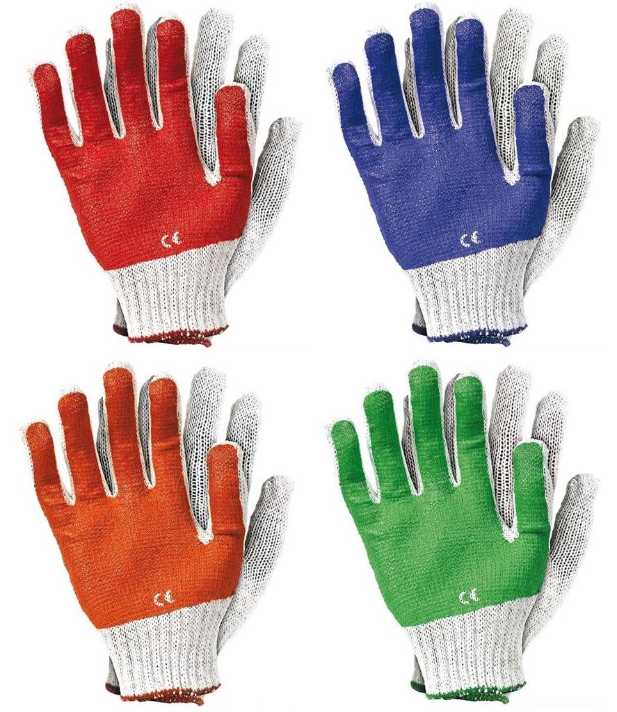 Protective gloves made of knitted fabric, coated. - evenly coated on the grip side with a mixture of latex and PVC, making them highly resistant to wear, including abrasion, tearing, and abrasion - due to the coating, they are resistant to acids, detergents, and detergents - used during reloading and transport - perfect for households - used for general mechanical work