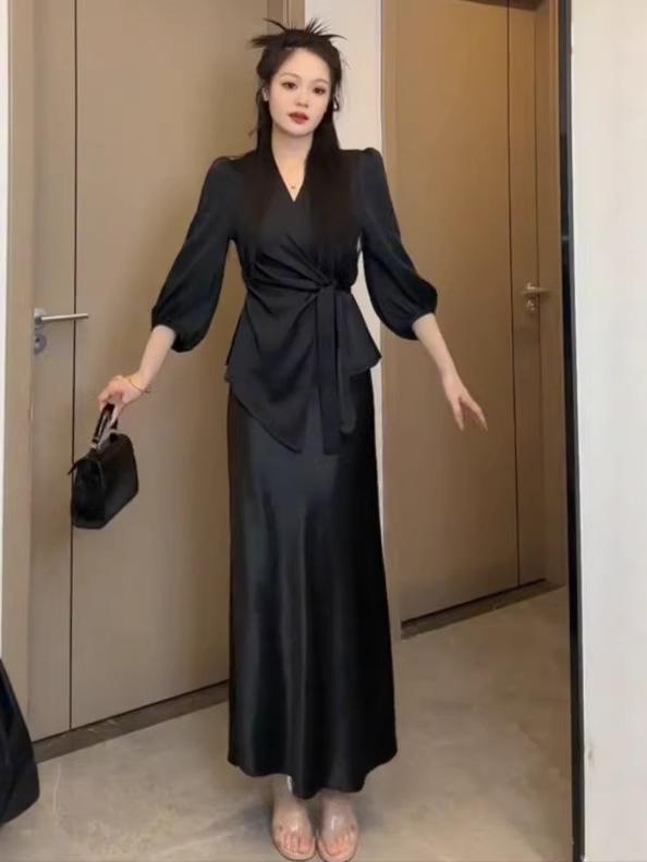 Women's Black Satin Fishtail Skirt - High Waist, Draped, with Slit - Spring/Summer 2026 Fashion