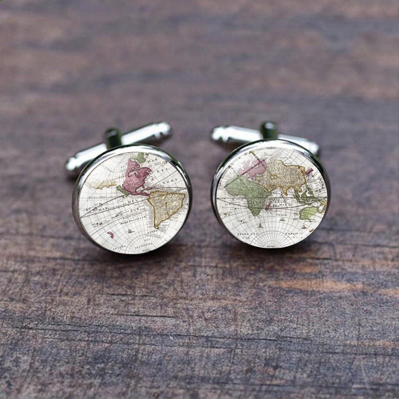 Retro World Map Time Gemstone Cufflink For Men, Fashionable Shirt Accessory, French Cufflink, Cufflink Studs.