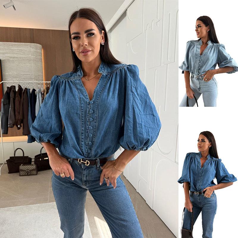 2025 Summer Casual V-Neck Denim Top for Women: Versatile, Loose-Fit European & American Style