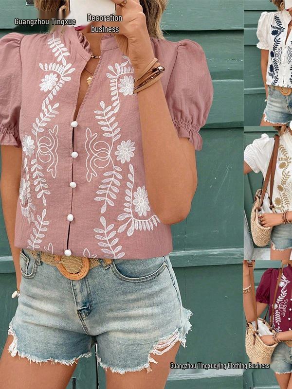 Introducing a charming addition to your spring and summer wardrobe, this women's puff sleeve cardigan top is crafted from soft and breathable cotton. Featuring a v-neckline and intricate embroidery, this top combines elegance with comfort. The short puff sleeves add a touch of femininity, making it perfect for both casual outings and special occasions. The button-up design offers versatility and ease, allowing you to style it as you wish. Embrace the season in style with this beautifully detailed piece.