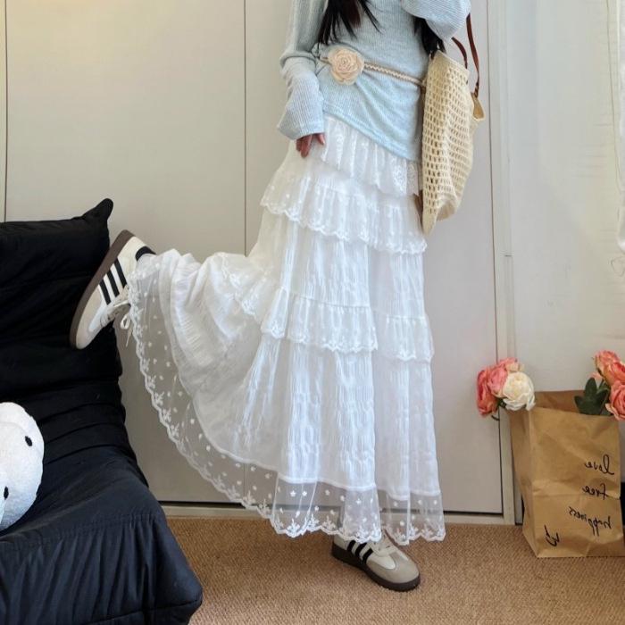 White Lace High-Waist Slimming Long Skirt for Women - Spring/Summer/Autumn