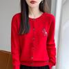 Introducing a high-end style sweater designed for women who appreciate elegance and comfort. This red knit cardigan features a soft and luxurious feel, made from a chemical fiber blended material that ensures durability and warmth. Its long sleeves and solid pattern add a touch of sophistication, while the round neckline offers a classic look. With a loose fit, this cardigan provides both style and ease of movement, making it a versatile addition to any wardrobe. Perfect for those seeking a chic and fashionable layer for various occasions.