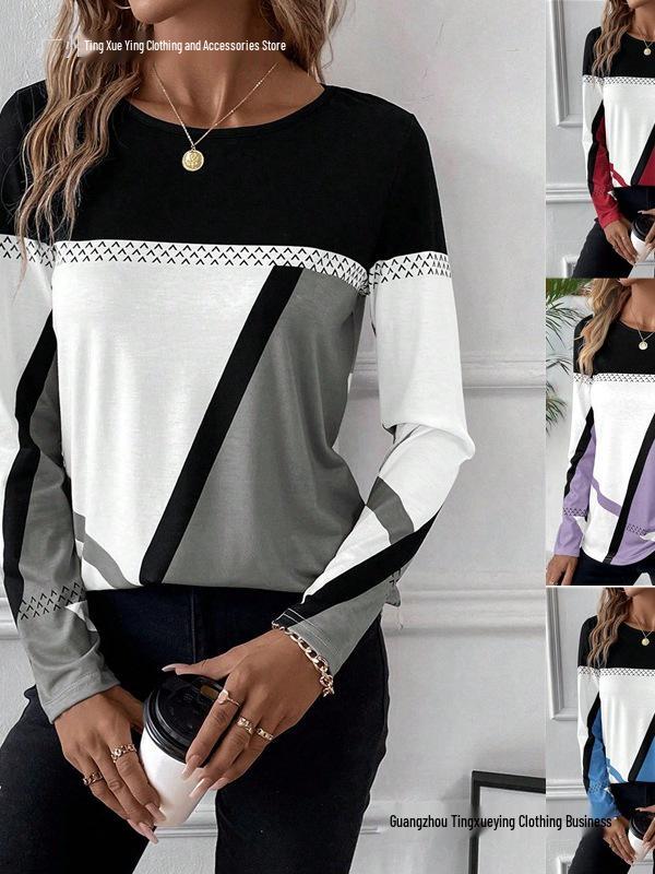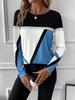Introducing a stylish women's pullover featuring a modern geometric print and eye-catching color block design. Made from a comfortable polyester-spandex blend, this top offers a soft and stretchy fit perfect for everyday wear. It features a classic round neckline and long sleeves, making it a versatile addition to your wardrobe. Ideal for layering or wearing on its own, this pullover effortlessly combines contemporary style with comfort.