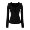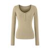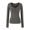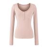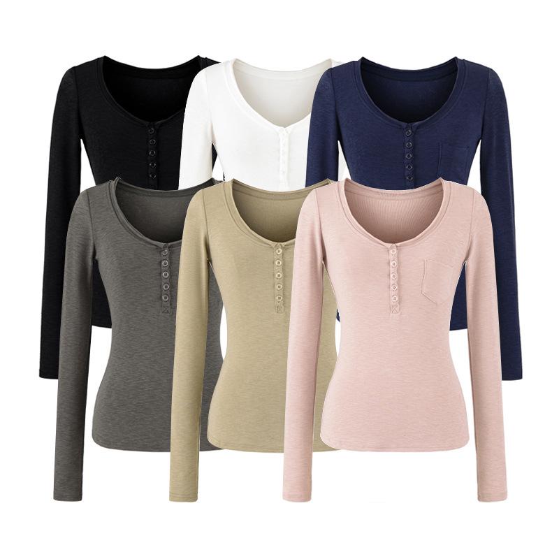 Women's Slim-Fit Long-Sleeve Henley V-Neck Top with Pocket, Stretchy Fine Cotton, Spring/Autumn Style