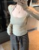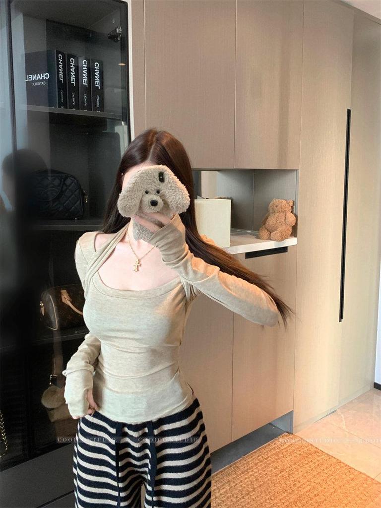 Korean Patchwork Square Neck Halterneck Long Sleeve T-shirt: Women's Slim Fit Early Spring Base Layer Pullover Top.