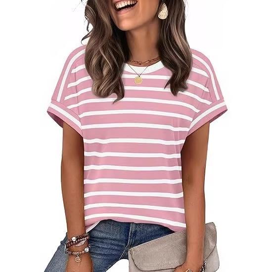 New Arrival Women's Round Neck Striped Color Block Casual Short Sleeve T-shirt