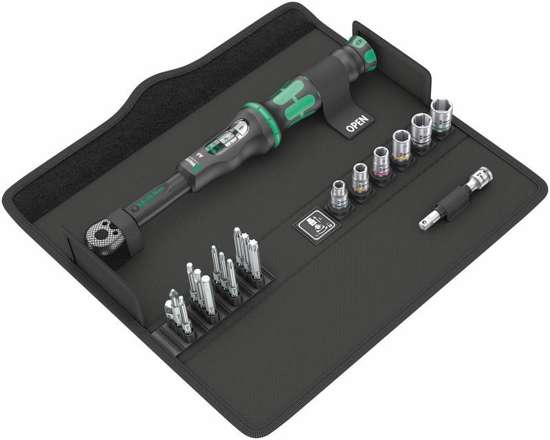 Technical data: Dimensions: 335x110x65 mm Weight: 1115 g Country of origin: CZ Easy adjustment and securing of the desired torque value with an audible and tactile lock after reaching the value on the scale (first click). safe force dosing: when the set value is reached, the torque wrench starts in an audible and tactile manner (second click) Accuracy of measurement up to ±4 % in accordance with DIN EN ISO 6789-1:2017-07. Adapter for sockets and extension included Compact , durable textile case protects surfaces exposed to scratches Set contents: Click-Torque A 6 torque wrench with reversible ratchet, 2.5-25 Nm, 1/4" x 2.5-25 Nm 05075605001 1x 1/4" x 2.5-25 Nm 851/4 TZ, PH 2 x 50 mm 05059810001 1x PH 2 x 50 mm 867/4 Z TORX®, TX 15 x 50 mm 05060133001 1x TX 15 x 50 mm 05060134001 1x TX 20 x 50 mm 05060135001 1x TX 25 x 50 mm 05060136001 1x TX 27 x 50 mm 05060137001 1x TX 30 x 50 mm 05060138001 1x TX 40 x 50 mm 840/4 Z, 3 x 50 mm 05059605001 1x 3 x 50 mm 05059610001 1x 4 x 50mm 05059615001 1x 5 x 50 mm 05059620001 1x 6 x 50 mm 870/1 Adapter, 1/4" x 25 mm 051360000011) 1x 1/4" x 25 mm 8794 SA Zyklop extension with swivel sleeve, short, 1/4", 1/4" x 75 mm 05003525001 1x 1/4" x 75 mm 8790 HMA Zyklop socket wrench, 1", 6 x 23 mm 05003505001 1x 6 x 23 mm 05003506001 1x 7 x 23 mm 05003507001 1x 8 x 23 mm 05003509001 1x 10 x 23 mm 05003511001 1x 12 x 23 mm 05003512001 1x 13 x 23 mm Velcro set 240, 50 x 240 mm 1x 50 x 240 mm **