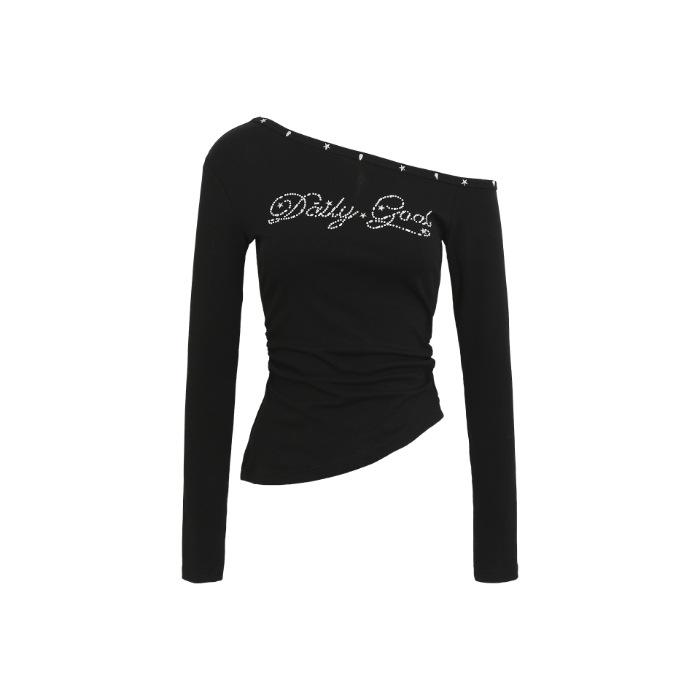 Chic Off-the-Shoulder Slim-Fit Black Long-Sleeve T-shirt for Women - Perfect for Early Autumn