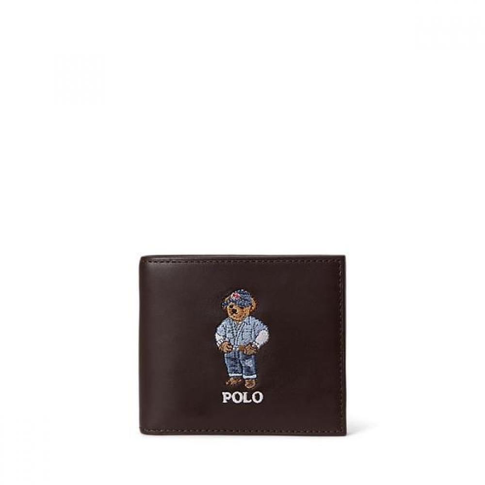 The Polo Ralph Lauren Men's Polo Bear Leather Billfold Wallet features the iconic Polo Bear, making it a slim billfold wallet. Crafted from waxed full-grain leather, it boasts durability and luster. With a slim design and single needle stitching, it includes 8 card slots, 1 bill pocket, and 2 slip pockets inside. The product dimensions are 9.5cm(H) x 10.8cm(L).