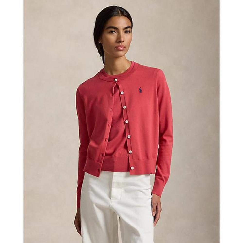 Combining soft combed cotton yarn with a button placket, this crew neck cardigan is finished with a signature pony embroidery on the chest.
