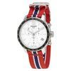 Wear your team on your wrist. Here is the NBA Washington Wizards. Stainless steel case with a red white and navy nylon NATO strap. Fixed stainless steel bezel with a black top ring showing tachymeter markings. Silver dial with luminous silver-tone hands and index hour markers. An Arabic numeral appears at the 12 o'clock position. Minute markers around the outer rim. Dial Type: Analog. Luminescent hands and markers. Date display at the 4 o'clock position. Chronograph - three sub-dials displaying: 60 second, 30 minute and 12 hour. ETA Caliber G10.211 quartz movement. Scratch resistant sapphire crystal. Solid case back. Case size: 42 mm. Case thickness: 10.72 mm. Round case shape. Strap width: 19 mm. Tang clasp. Water resistant at 100 meters / 330 feet. Functions: chronograph, date, hour, minute, second, tachymeter. Sport watch style. Watch label: Swiss Made. Tissot Quickster Washington Wizards Chronograph Men's Watch T0954171703732.