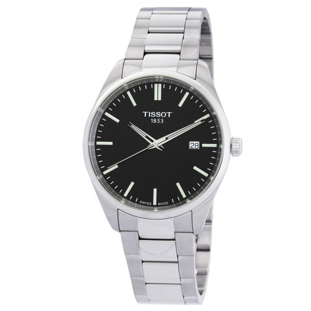 Silver-tone stainless steel case and bracelet. Fixed silver-tone stainless steel bezel. Black dial with silver-tone hands and index hour markers. Minute markers around the outer rim. Dial Type: Analog. Luminescent hands and markers. Date display at the 3 o'clock position. Renata 371 quartz movement. Scratch resistant sapphire crystal. Pull / push crown. Solid case back. Round case shape, case size: 40 mm, case thickness: 8.3 mm. Band width: 20 mm. Butterfly clasp. Water resistant at 100 meters / 330 feet. Functions: date, hour, minute, second. Pr 100 Series. Casual watch style. Watch label: Swiss Made. Tissot PR 100 Quartz Black Dial Men's Watch T1504101105100.