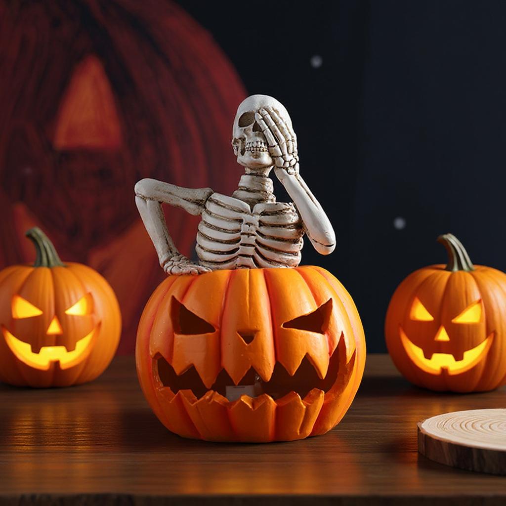 Halloween Pumpkin Skeleton Figurine Spooky Ghost Festival Skull with LED Lights Resin Crafts Sculpture Home Office Desktop