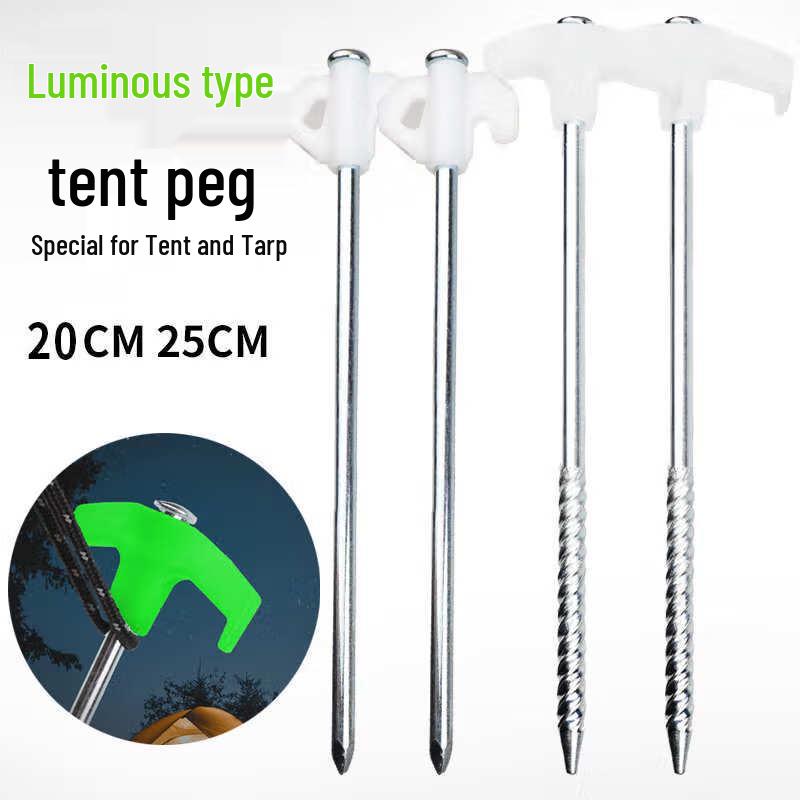 These luminous ground pegs are essential for outdoor camping, providing secure fixation for tents and tarps. Their glow-in-the-dark feature enhances visibility and safety at night. Crafted from durable steel, they ensure strong anchoring.