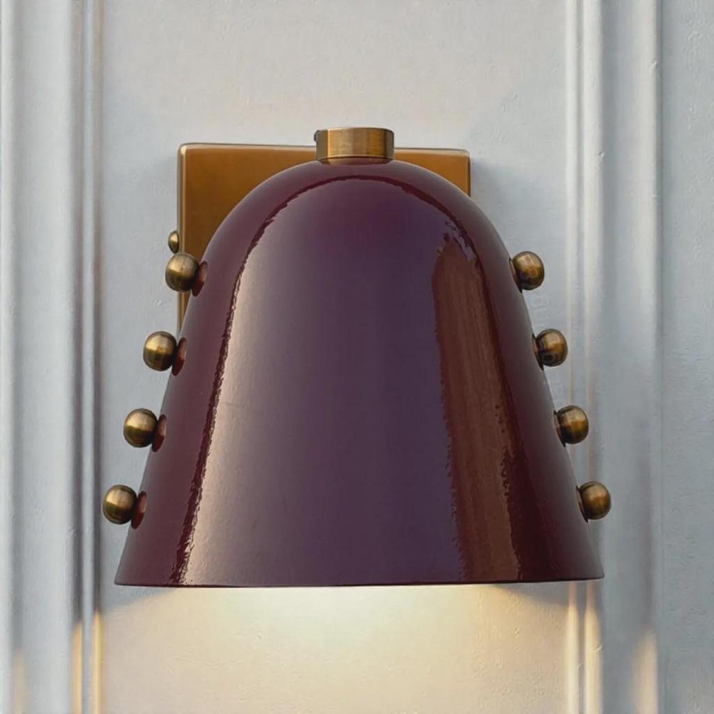 Make a striking design statement with this bold brass cone wall sconce, featuring a rich wine red shade accented by hand-set rivet details. Inspired by mid-century modern design, this sculptural wall light blends clean geometric lines with warm metallic tones for a look that feels both timeless and contemporary.